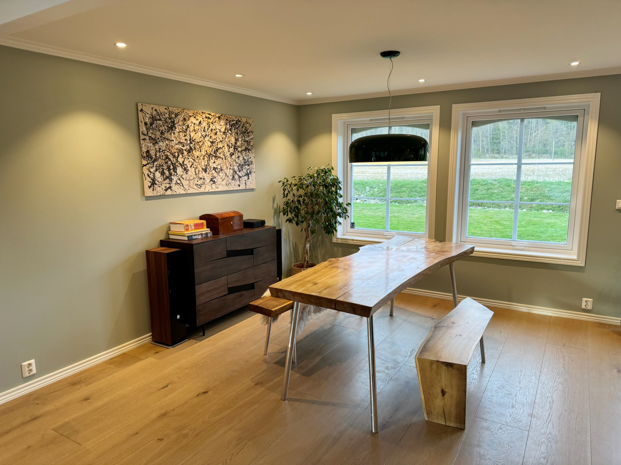Kurvene og den spisse enden er bevart for å få frem de naturlige kurvene og originaliteten til planken, slik den en gang ble skråskjert i ende.