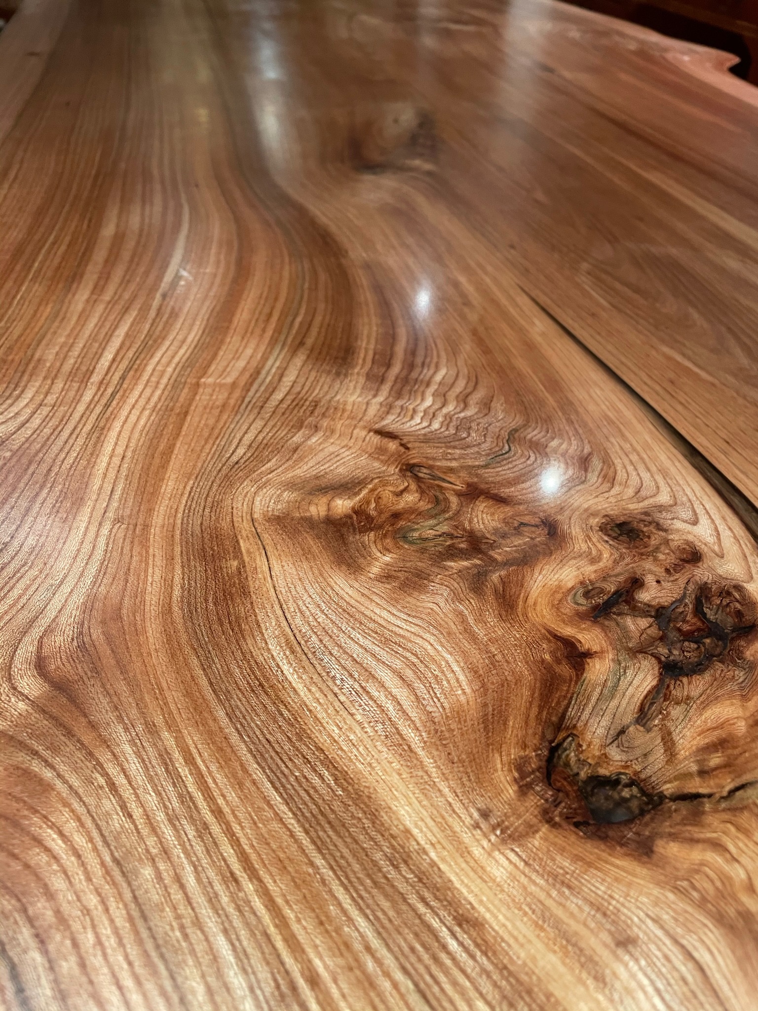 Nøye utvalgt og utformet treplate i Alm fra Sør Norge med vakre spill og mønstre. Kantene er beholdt nær sin naturlige form for å fremheve de vakre linjene i hundre år gamle trestammen. Endene er snittsagd i vinkler som gir et lettere preg på den solide bordplaten.